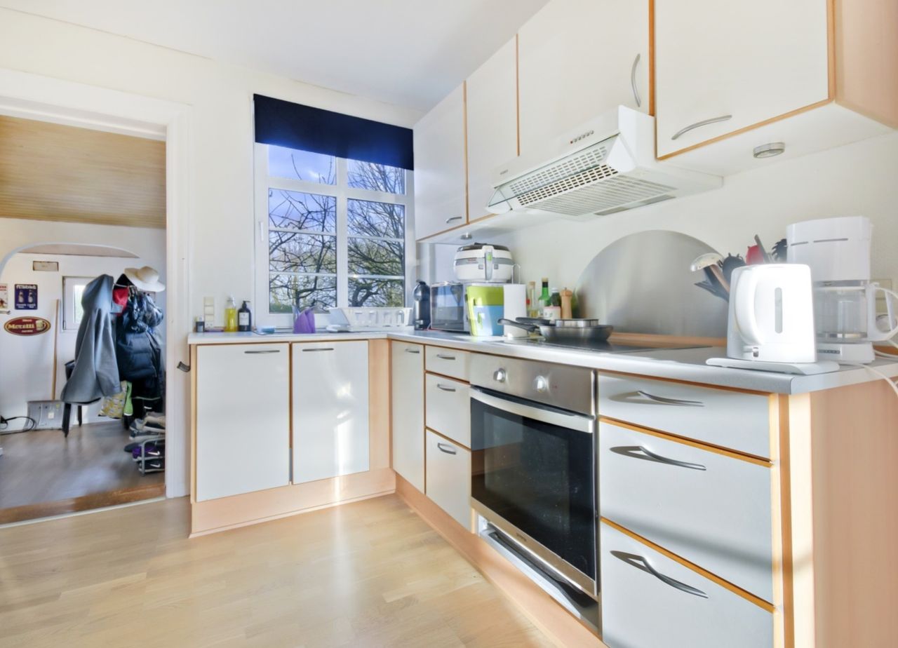Køkkenet er et sandt hjerterum med udsigt over haven og direkte adgang til både viktualierum og bryggers. Det store soveværelse med trægulv skaber en rolig og behagelig atmosfære. Førstesalen rummer et stort, åbent rum, perfekt til kontor, hobbyrum eller ekstra stue, samt et ekstra værelse.
