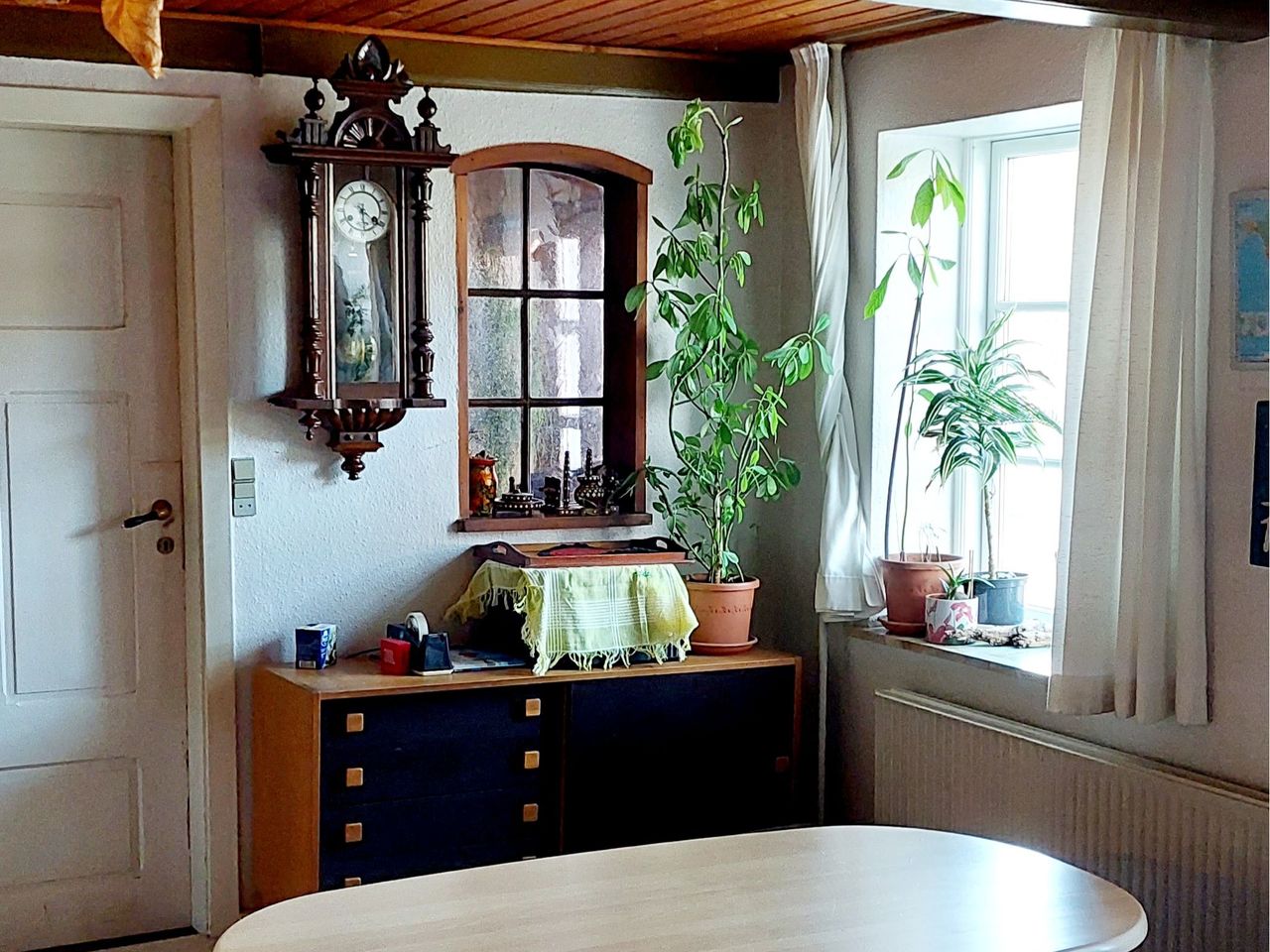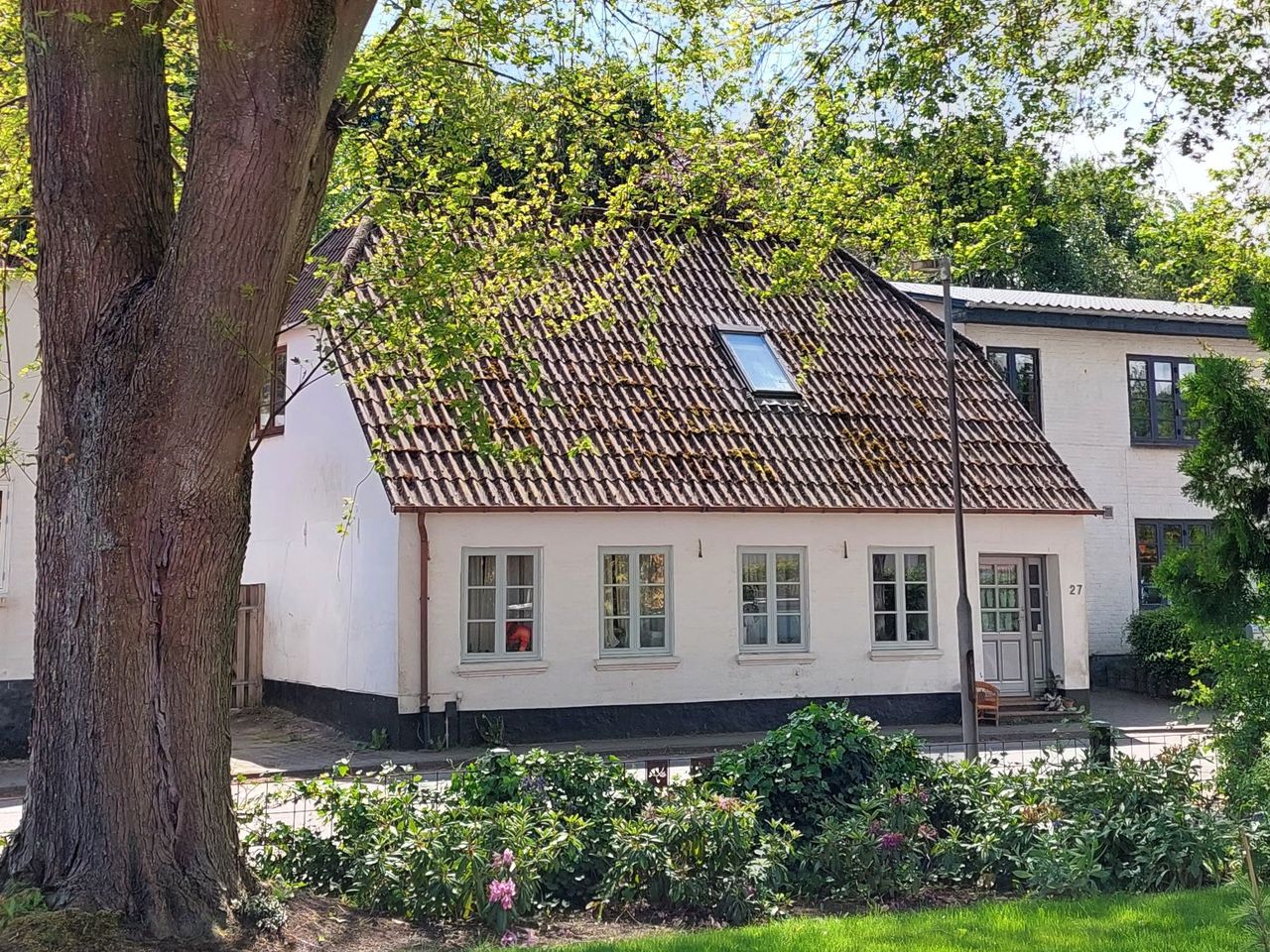 Stuen er hyggelig og stemningsfuld med lavt til loftet og sprossede vinduer, der giver et fint kig til gaden og understreger husets autentiske udtryk. Herfra er der adgang til køkkenet, som rummer en mindre spiseplads, der fungerer som et naturligt samlingspunkt i hverdagen.