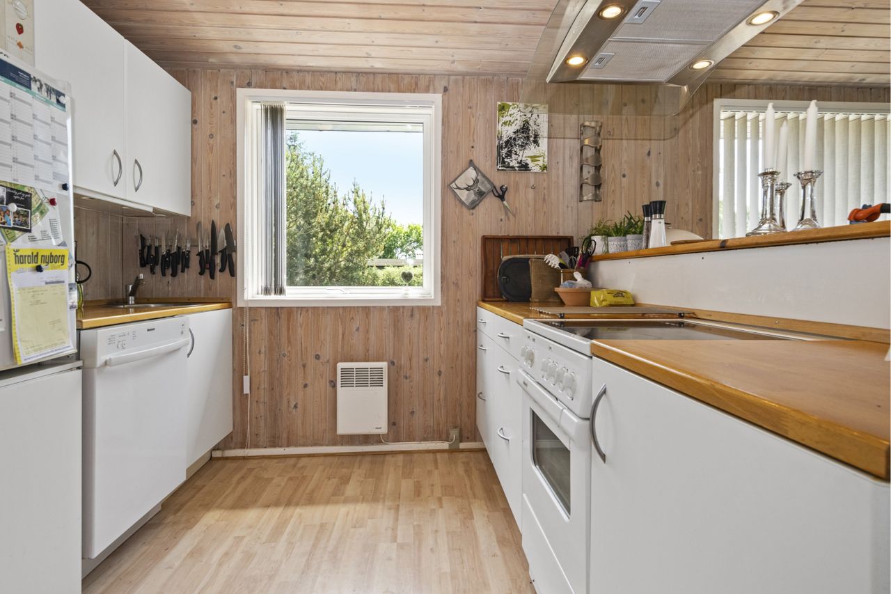 ved køkkenet og et hyggeligt sofa område, endvidere er her brændeovn og direkte adgang til den