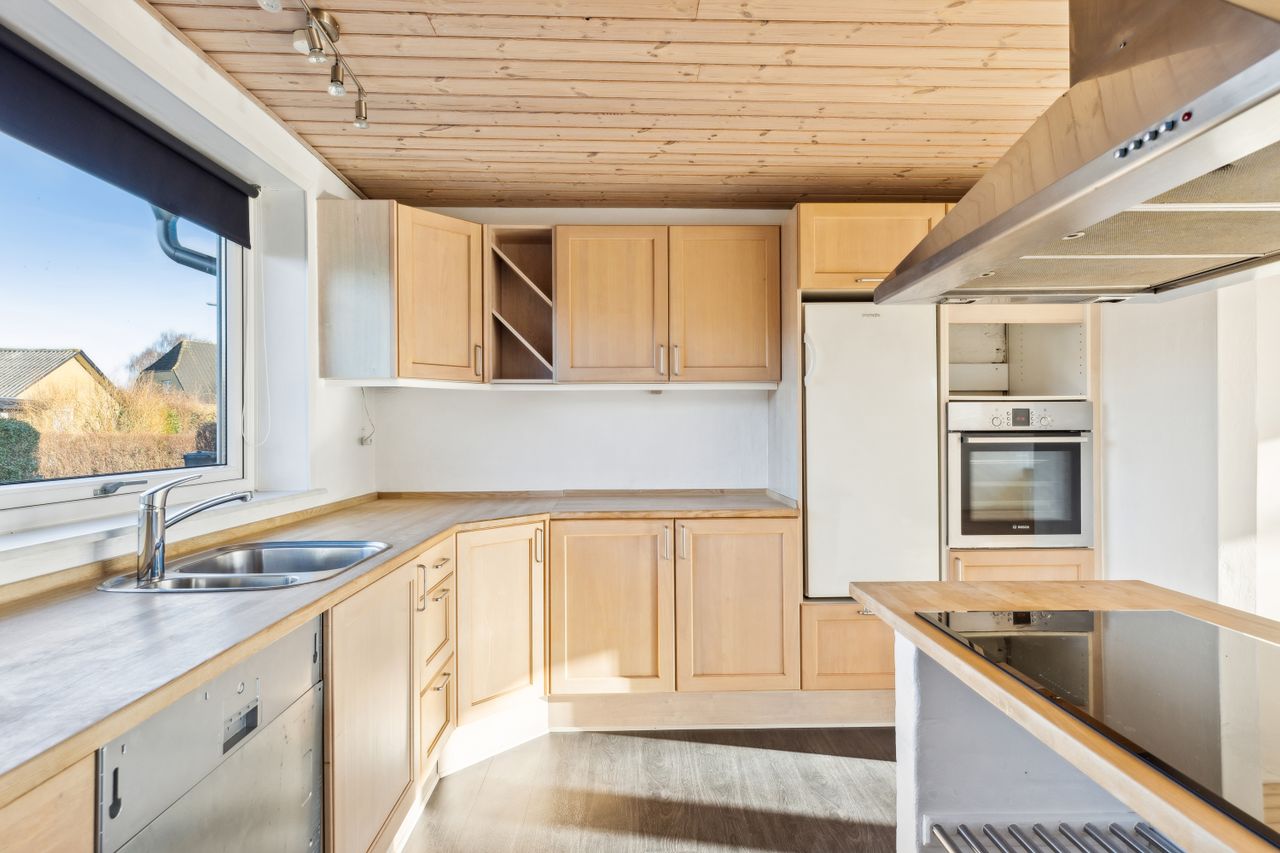 Husets hjerte er den rummelige stue, som har store vinduer, der sikrer et fantastisk lysindfald. Stuen er i åben forbindelse med et funktionelt køkken, hvilket skaber en indbydende atmosfære, ideel til både hverdag og gæster. Her finder du også en hyggelig brændeovn, der giver varme og charme på kølige dage. Fra stuen er der direkte udgang til terrassen, hvor du kan nyde udelivet i den dejlige have.
