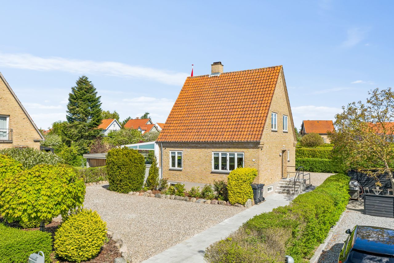I åbner døren til en villa fra 1956 på 112 m2 med klassisk arkitektur. Mens I går op ad trappen, mærker I den helt særlig stemning som det klassiske trappegelænder, de indbyggede skabe og de smukke gamle, bevarede stikkontakter giver. De originale detaljer er, i den nylige renovering, bevaret med stor kærlighed og omhu.