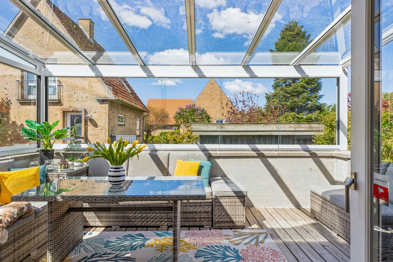 I det lyse og store køkken i forbindelse med stue og alrum falder lyset ind ad de stilfulde vinduer, og fra stuen åbner døren sig til den exceptionelle overdækkede terrasse. Et sandt fristed med glastag og skydesider.