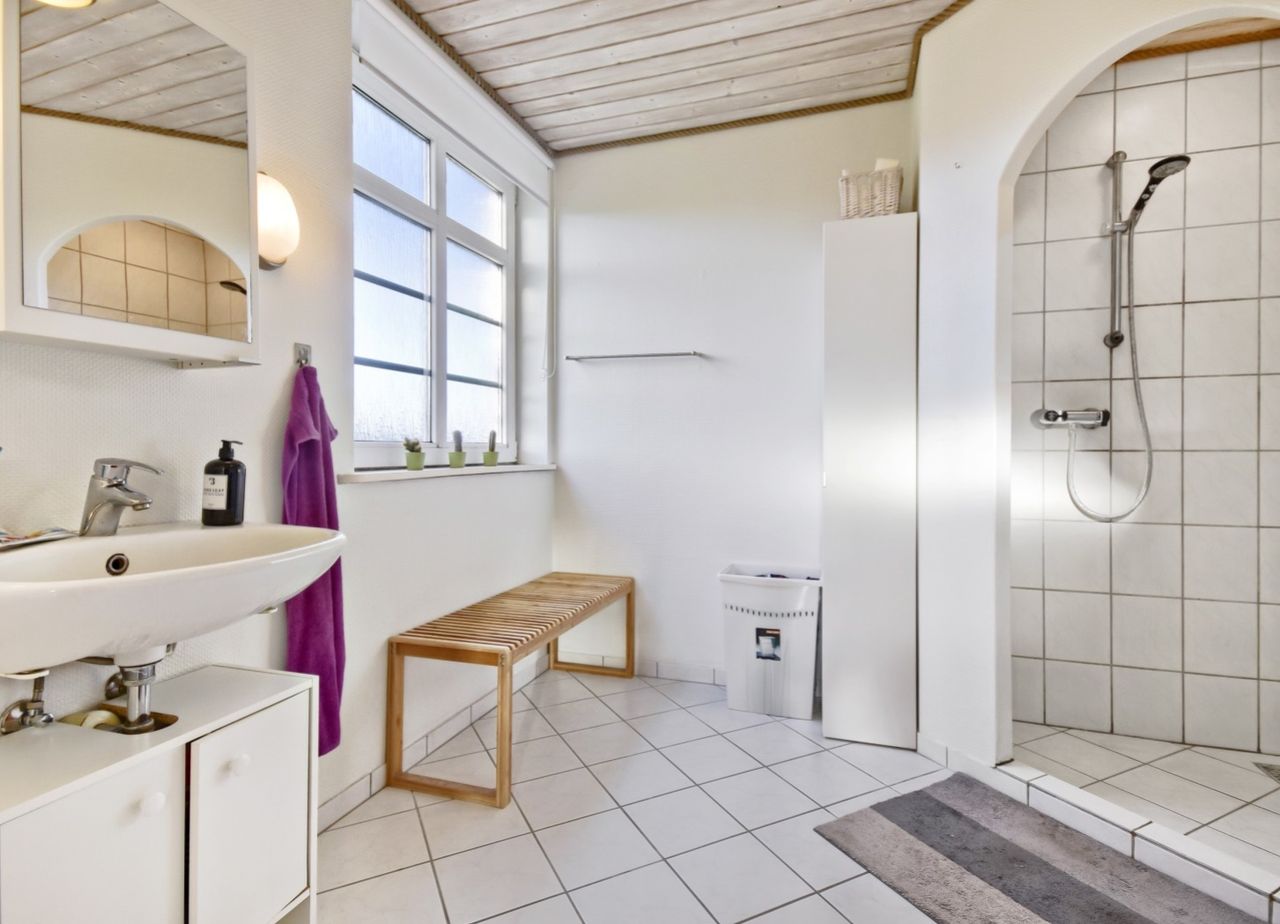 Når du træder ind i huset, mødes du af en indbydende entré med en elegant, lukket trappe til første sal. Det store badeværelse byder på en muret brusekabine, der giver en følelse af luksus. Den rummelige stue/spisestue med smukke plankegulve er ideel til både afslapning og hyggelige middage.