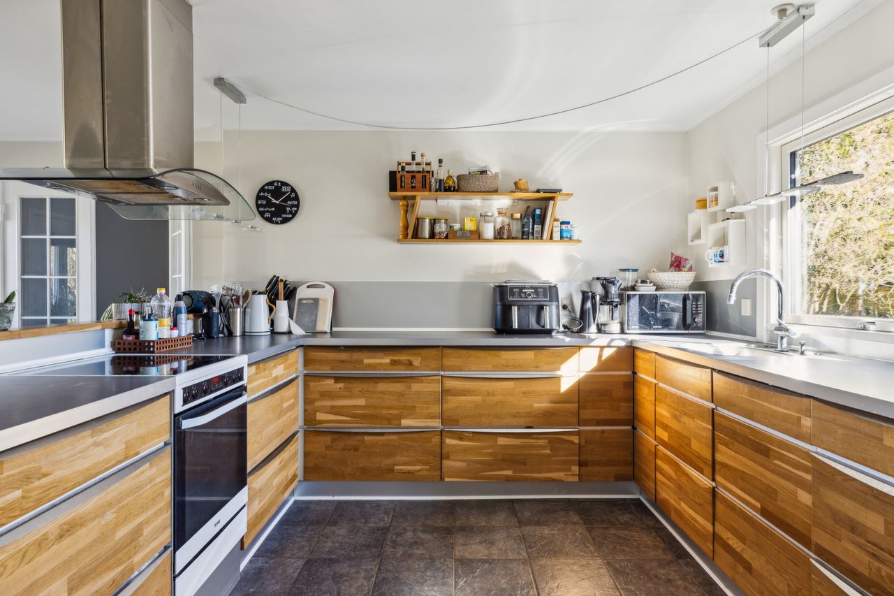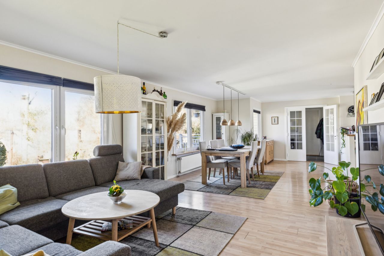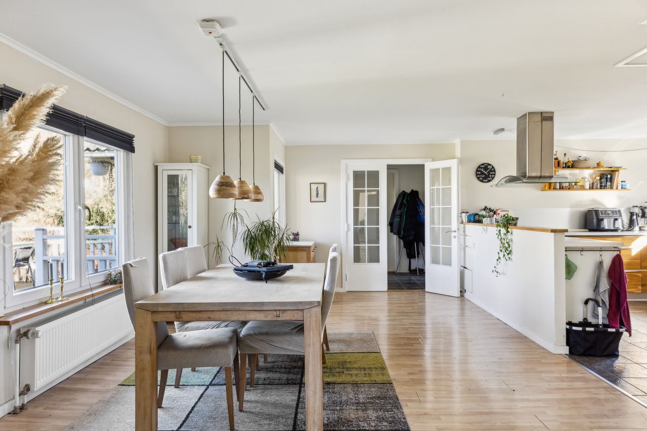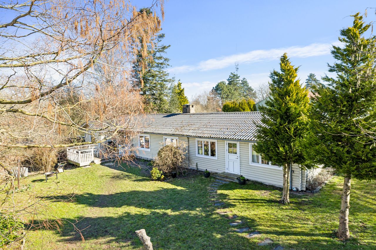 Huset byder på 5 rummelige værelser og 2 lyse stuer, hvoraf den ene stue er åbent forbundet med et smukt U-formet køkken. Denne åbne løsning skaber et naturligt flow af lys, der gør både stuen og køkkenet hyggelige og indbydende. Huset har en dejlig terrasse og en smuk have, som omkranser huset med grønne arealer og skøn natur.