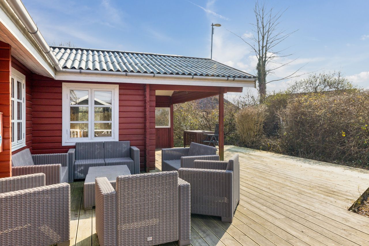 Udenfor finder man en stor terrasse, ideel til hyggelige aftener. Grunden er på 800 m² og omgivet af høje træer, hvilket skaber en følelse af privatliv og ro.