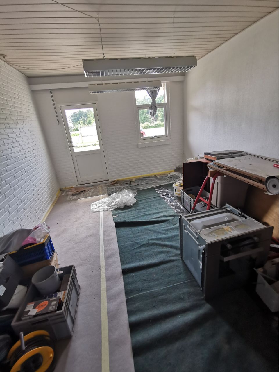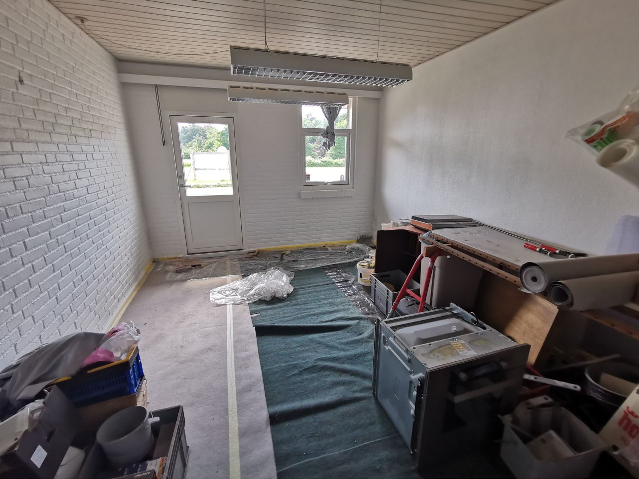 Lokalet har en god loftshøjde, med lyse lofte, og hvide vægge. Der er gulvtæppe på gulvet.