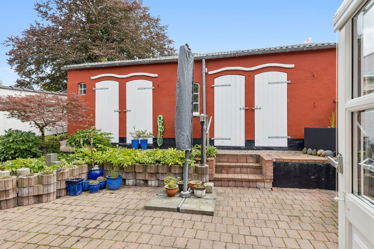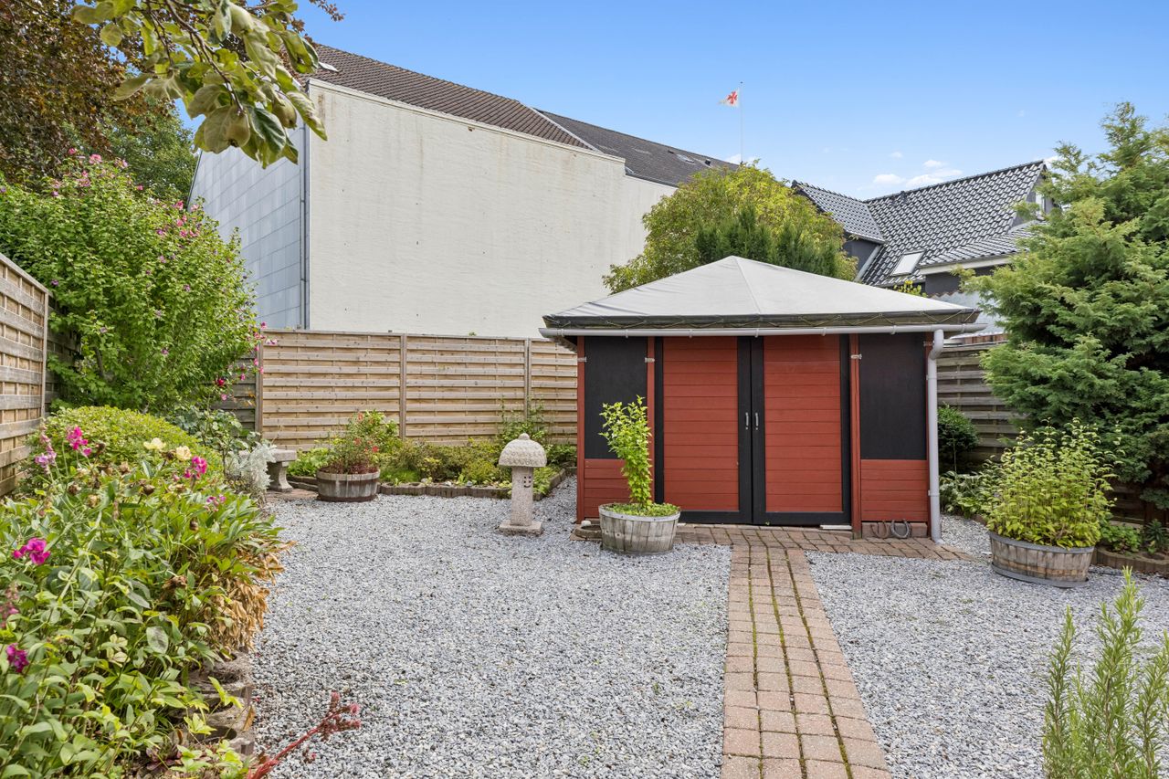 Også husets uderum får dig til at trække vejret frit og sænke skuldrene. Bag huset får du et grønt frirum af de sjældnere: 2 afskærmede gårdhaver. Smukt anlagte med staudebede, terrasser og med ly fra byens pulserende liv. Den første ligger mellem huset og det fine, rødmalede udhus. Udhuset rummer værksted, bryggers, et disponibelt rum samt et lille haverum. Det disponible rum er oplagt at indrette som et ekstra gæsteværelse, atelier eller kreaværksted. Gårdhaven er flot anlagt med staudebede og terrasser og er perfekt til både hverdag og gæster.
